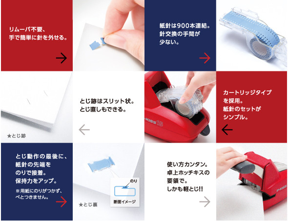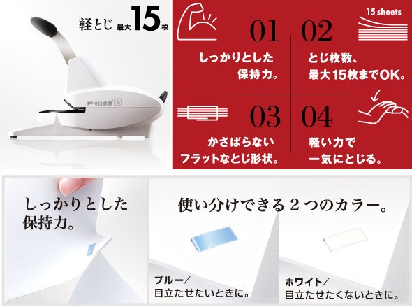 12日 8月 2013 紙針ホッチキス「P-KISS15」 ホッチキス針(コの字)形状の紙針を使って、紙針で最大15枚軽とじ、金属針を使わず、簡単な操作でしっかりとじられるMAXの紙針ホッチキス「P-KISS(ピーキス)」 金属を使わないので、金属針が使えないところでもお使いいただけます。 メーカー希望小売価格は、税込¥17,640-です。 Facebook に接続する tagPlaceholderカテゴリ: 新商品, 2013年8月