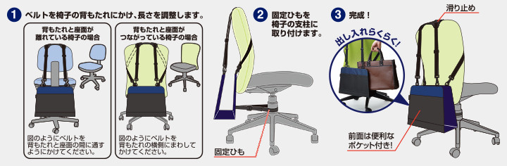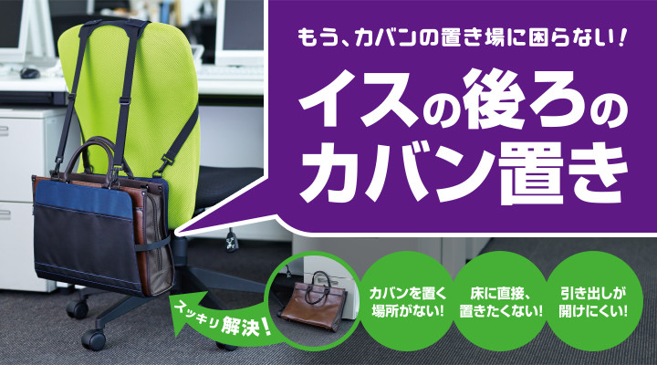 その名の通り、いすの後ろに取り付けて、カバンを置ける便利グッズです。
