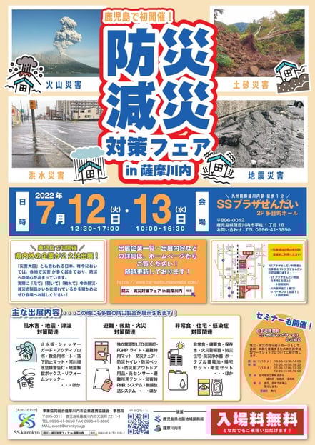 21日 6月 2022 防災・減災対策フェア 7月12日13日に開催される防災・減災対策フェスタin薩摩川内に出展します。 梅雨も本格化して大雨が降ったりもしています。 弊社以外にも薩摩川内市内外から20数社の出展があるそうです。 オフィスの防災対策の参考に是非お越しいただきご覧いただきたいと思います。 tagPlaceholderカテゴリ: